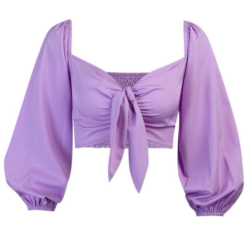 Off-Shoulder V-Neck Long Puff Lantern Sleeve Lace Up Crop Top Blouse