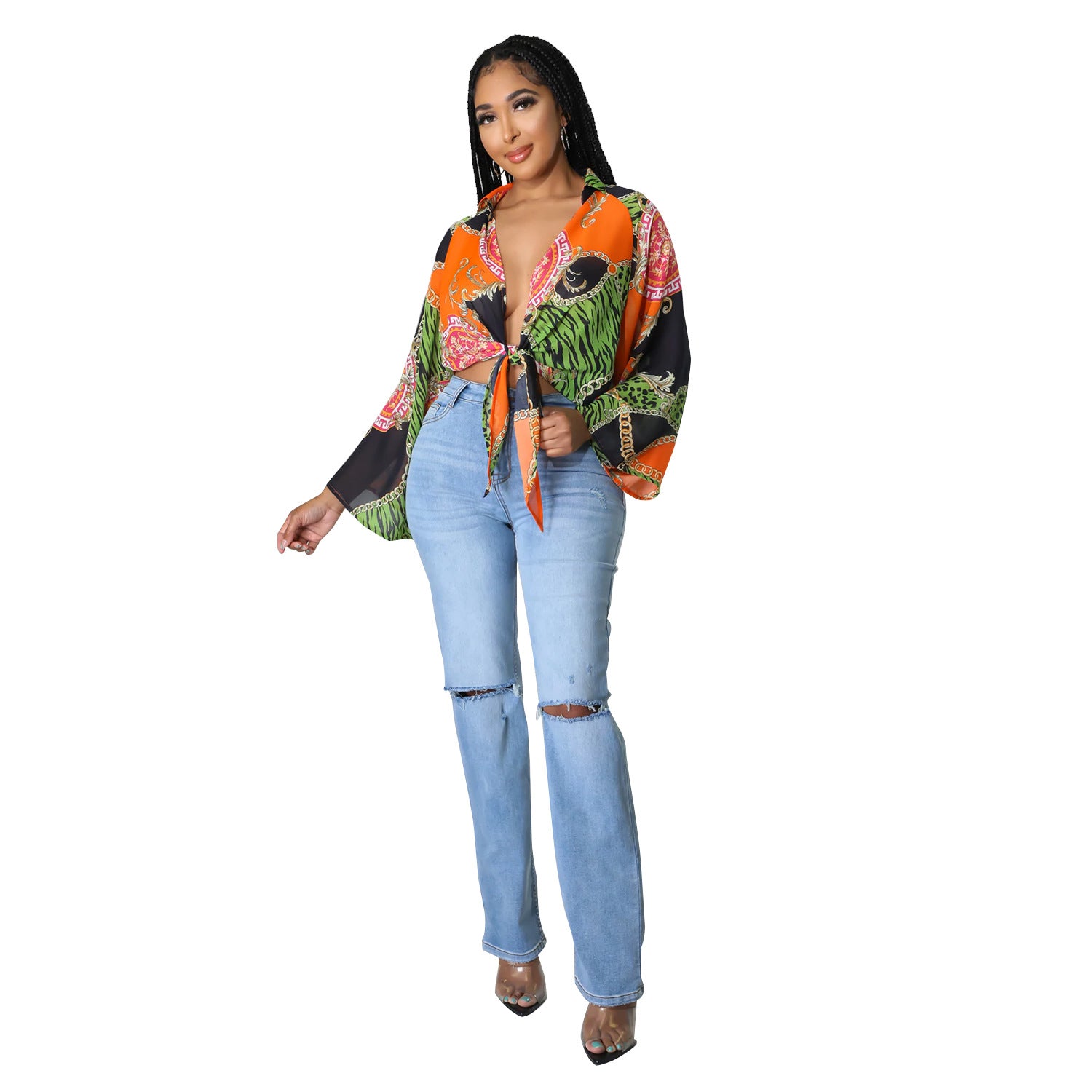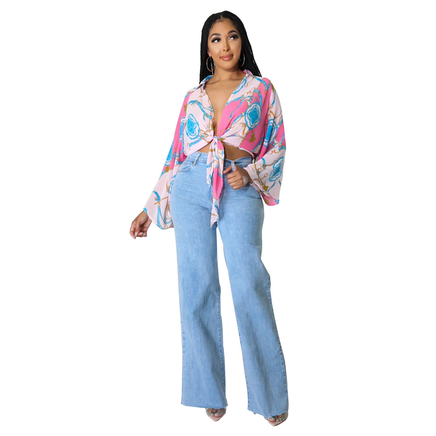 Women's Fashion Print Long Sleeve Flared Sleeve Crop Top